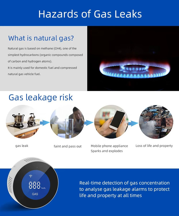 سنسور گاز هوشمند Tuya WiFi با LCD – تشخیص سریع نشت گاز LPG و شهری و کنترل از راه دور