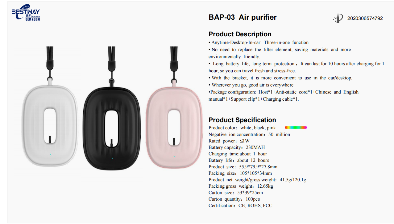 مدل جدید BAP‑03 نسل تازهای از تصفیهکنندههای یون منفی است که با طراحی جذاب و وزن فوقالعاده سبک، برای استفاده در خودرو، روی میز کار یا حتی هنگام سفر طراحی شده است. این دستگاه بدون نیاز به فیلتر، با آزادسازی ۵۰ میلیون یون منفی، ذرات گرد و غبار و آلودگیهای هوا را به سرعت خنثی کرده و محیطی سالم و آرامشبخش برای تنفس فراهم میکند 🌱. BAP‑03 با شارژ سریع یکساعته، تا ۱۲ ساعت کامل کار میکند — انتخابی عالی برای هوای تمیز در هر مکان 🚗💻🌿.